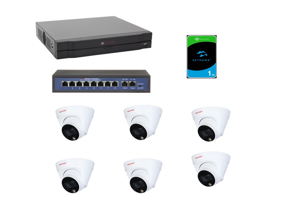 Set se skládá ze síťového videorekordéru, 6 IP kamer, PoE switche i 1TB HDD. Pro jeho instalaci a připojení kamer je tedy potřeba již jen UTP kabeláž, která není součástí dodávky.